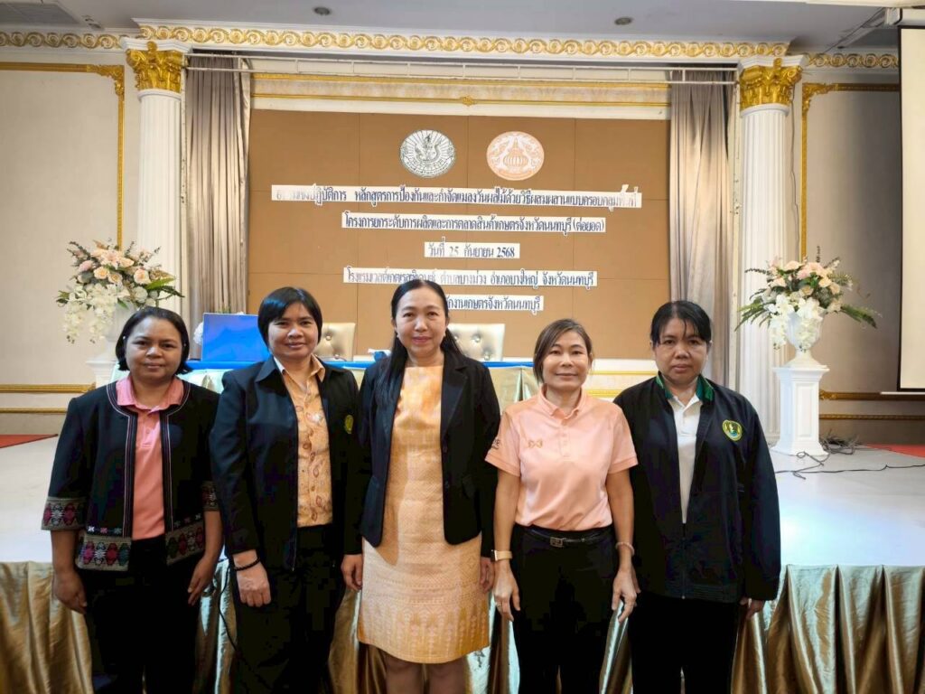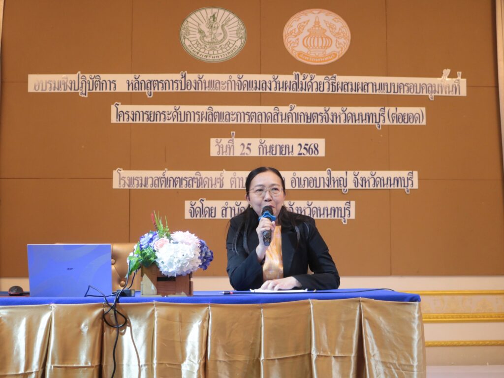 วันที่ 25 กันยายน 2568 – นางพลัศริญญา อมรพันธุ์ศักดิ์ เกษตรจังหวัดนนทบุรี เป็นประธานเปิดการอบรมเชิงปฏิบัติการหลักสูตรการป้องกันและกำจัดแมลงวันผลไม้ด้วยวิธีผสมผสานแบบครอบคลุมพื้นที่ ภายใต้โครงการยกระดับการผลิตและการตลาดสินค้าเกษตรจังหวัดนนทบุรี (ต่อยอด) ณ โรงแรมเวสต์เกต เรสซิเดนซ์ อำเภอบางใหญ่ จังหวัดนนทบุรี