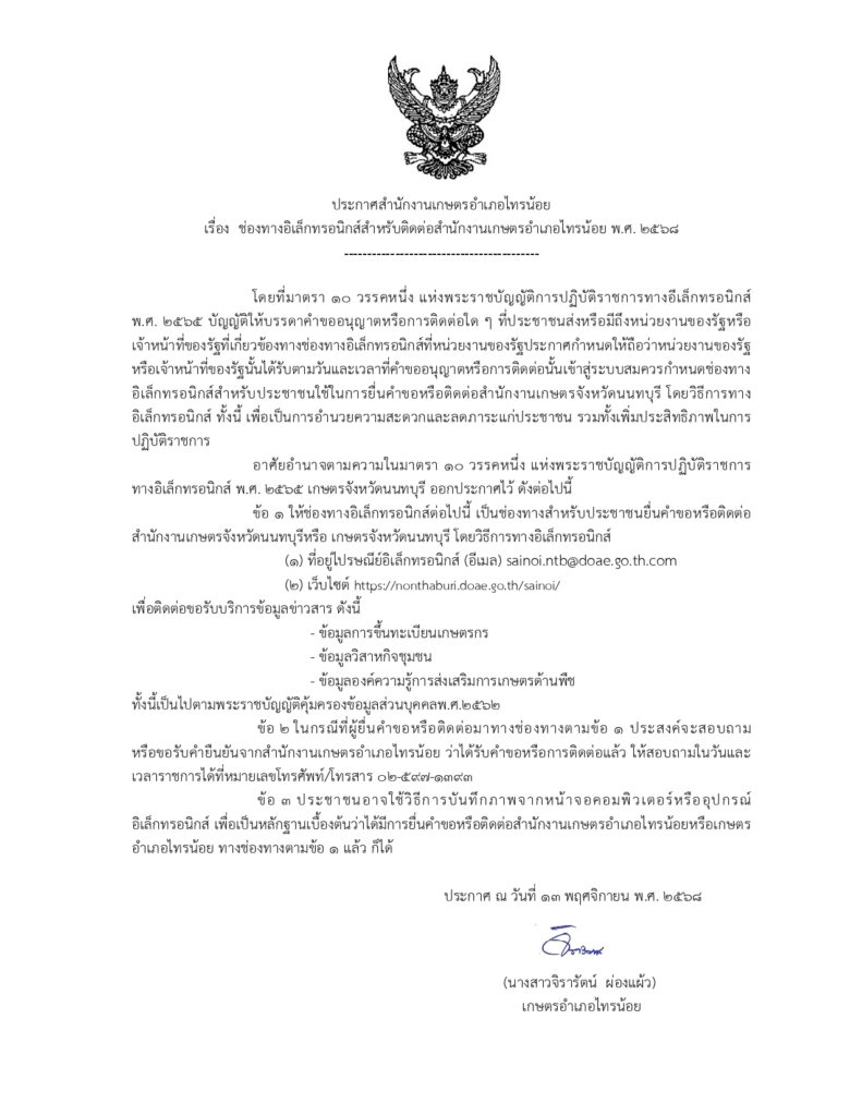 ประกาศสำนักงานเกษตรอำเภอไทรน้อย เรื่อง ช่องทางอิเล็กทรอนิกส์สำหรับติดต่อสำนักงานเกษตรอำเภอไทรน้อย พ.ศ. 2568By sainoi_admin / 14 พฤศจิกายน 2025